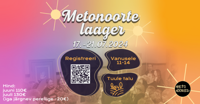 Metonoorte laagrid 15+ noortelaager – registreerimine 11-14 teismeliste laager – registreerimine G2 laagrid Noortelaager 15+ Teismeliste laager 11-14 Lastelaager 8-12