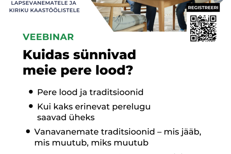 Pühapäeval, 12. aprillil 2026 kell 18.00–19.30 toimub Zoomi vahendusel veebinarisarja „Meie lapsed kirikus“ hooaja viimane kohtumine. Teema: Kuidas sünnivad meie pere lood? Räägime koos: • pere lugudest ja traditsioonidest • sellest, kuidas kaks erinevat perelugu saavad üheks • vanavanemate pärandist – mis jääb, mis muutub ja miks Külaliseks on armastatud psühholoog ja teoloog Meeli Tankler…
